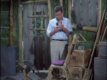 The Supply Hut is the storage building of all the Castaways supplies, food, freshwater, tools and objects salvaged from the S.S. Minnow. It was the third hut constructed after the second Communal Hut before the creation of the individual huts. Once a small disheveled booth with an uneven hut, it was probably damaged by a storm or repaired for some reason, because it ends up larger with a wooden door and higher ceiling. It also becomes known as the Professor's hut as he sleeps here, but this is mostly because he can do his experiments here and read without loud noises and distractions, often treating the others here for maladies and injuries (mostly Gilligan). The girls sometimes use it as a food prep area, especially in Mr. and Mrs. ???. He also lends it out on occasion to visitors like Lord Beasley Waterford. Gilligan also uses it to hide things he collects on the island, such as a large pile of feathers. Mr. Howell briefly moves into it during a fight with Mrs. Howell, calling it "Harvard Club Annex."